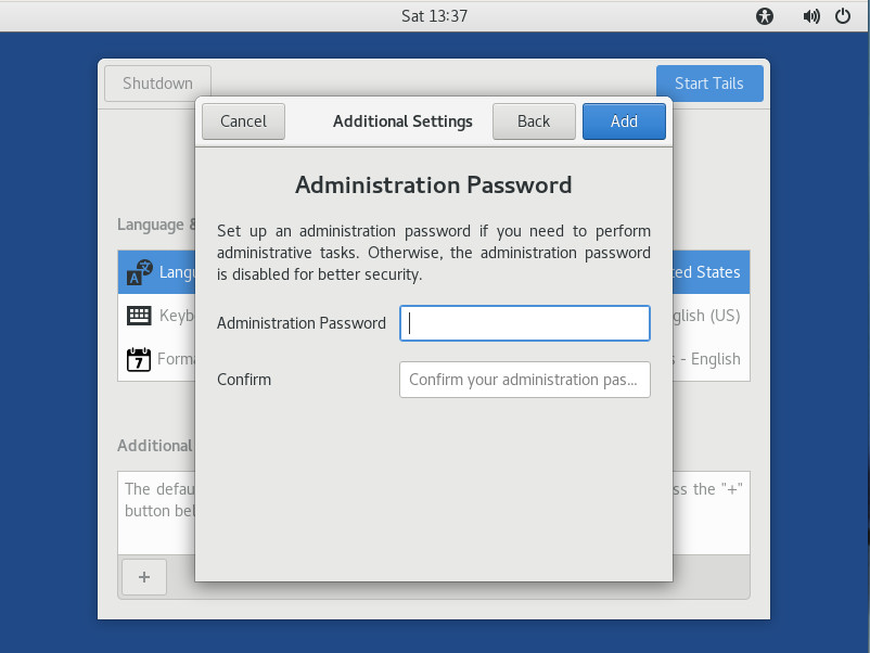 One thing you should know about tails is that it defaults to the user, amnesia. This particular user is not a member of sudo, so it is not allowed to execute tasks that require administrative permission. You can get around that during the startup. Click Additional settings at the Tails Greeter and then click Administration password. Type and verify the new administrator password and click Add (Figure 4).