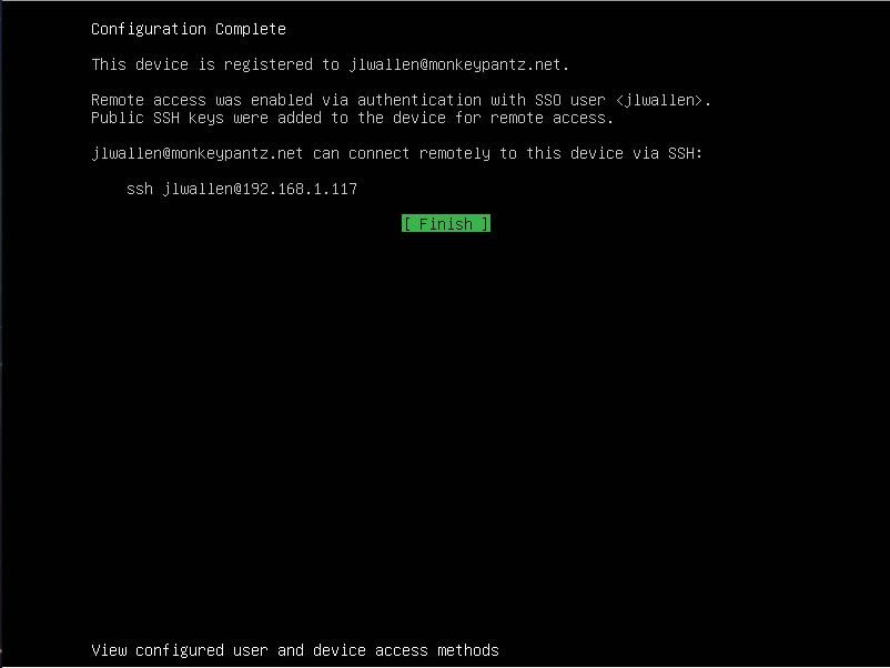 Figure 4:The Ubuntu Core screen indicating a remote access enabled via Ubuntu One user.