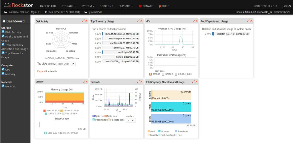 Rockstor also includes an at-a-glance dashboard that gives admins quick access to all the information they need about their server (Figure 4).