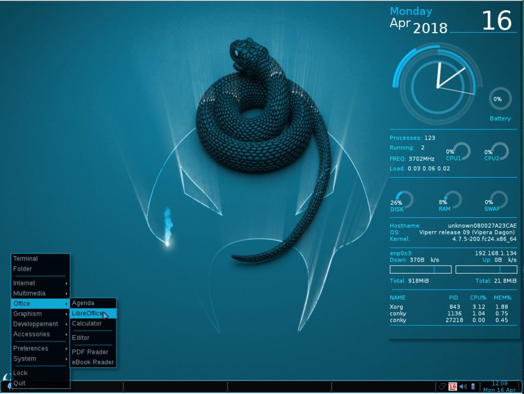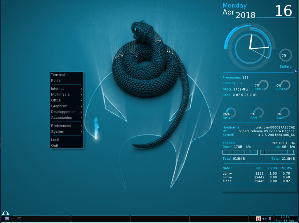 As you probably expect, using Viperr is incredibly simple. The combination of the Openbox window manager and Conky giving a real-time read-out on system resources (Figure 3) is certainly a throwback to old-school Linux that many users will appreciate.