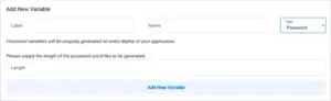Similar to user-supplied variables, you can also create one or more uniquely generated passwords at each deployment with password variables. The system generates these automatically, and the user is not prompted to supply the value. Like user-supplied variables, you can show these in your application instructions and use them in deployment scripts.